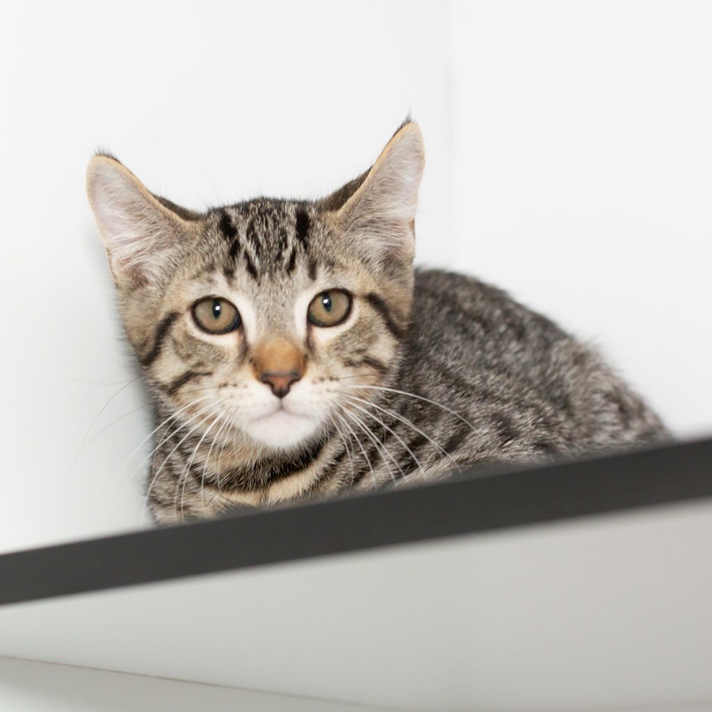 With encouragement from his more outgoing siblings, Nutmeg has started to discover the joys of kitten life: chasing wand toys, batting at balls, and exploring tunnels at his own pace. Once he feels safe, his subtle, affectionate nature begins to shine.