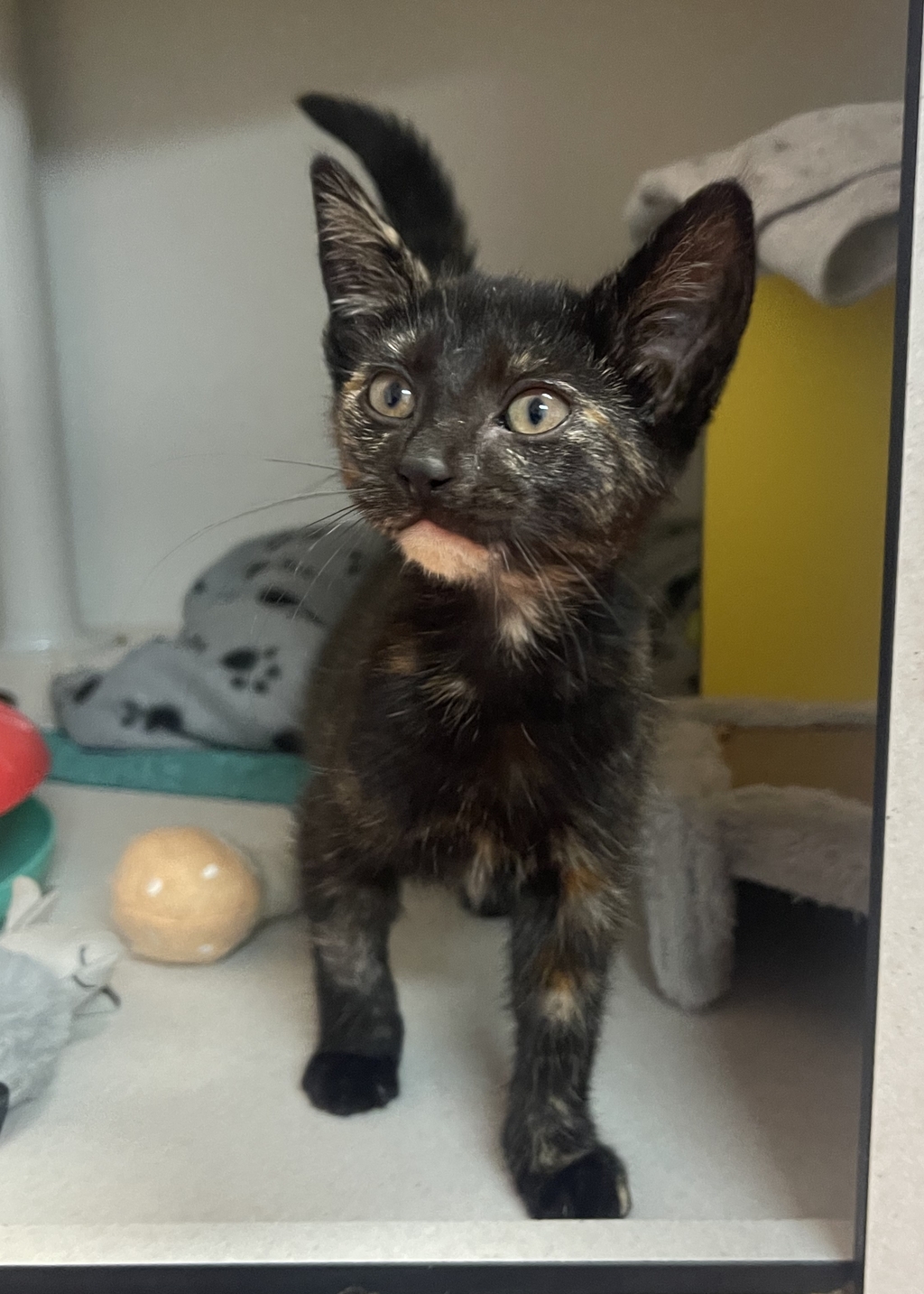 Puffin is a gorgeous torti kitten with plenty to say! This sweet girl is very vocal and loves to chat with her people, making sure she's always part of the conversation. Full of kitten energy, Puffin adores toys and will happily pounce, chase, and play to her heart's content.