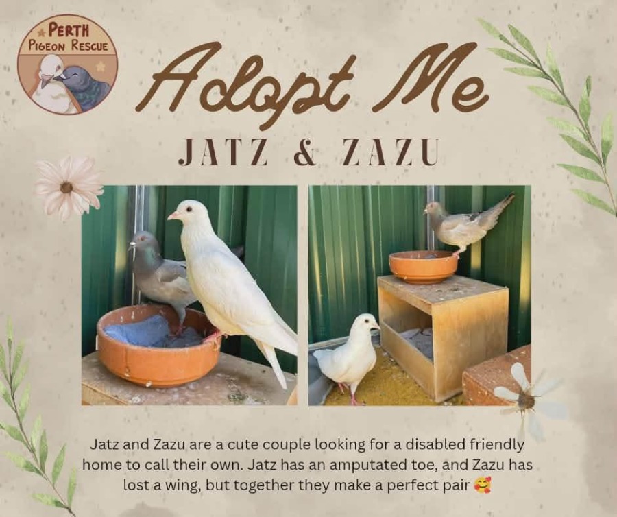 Together, they are settled, gentle pigeons who would be best suited to disabled friendly (low flat perches) indoor living or a flightless-friendly aviary.