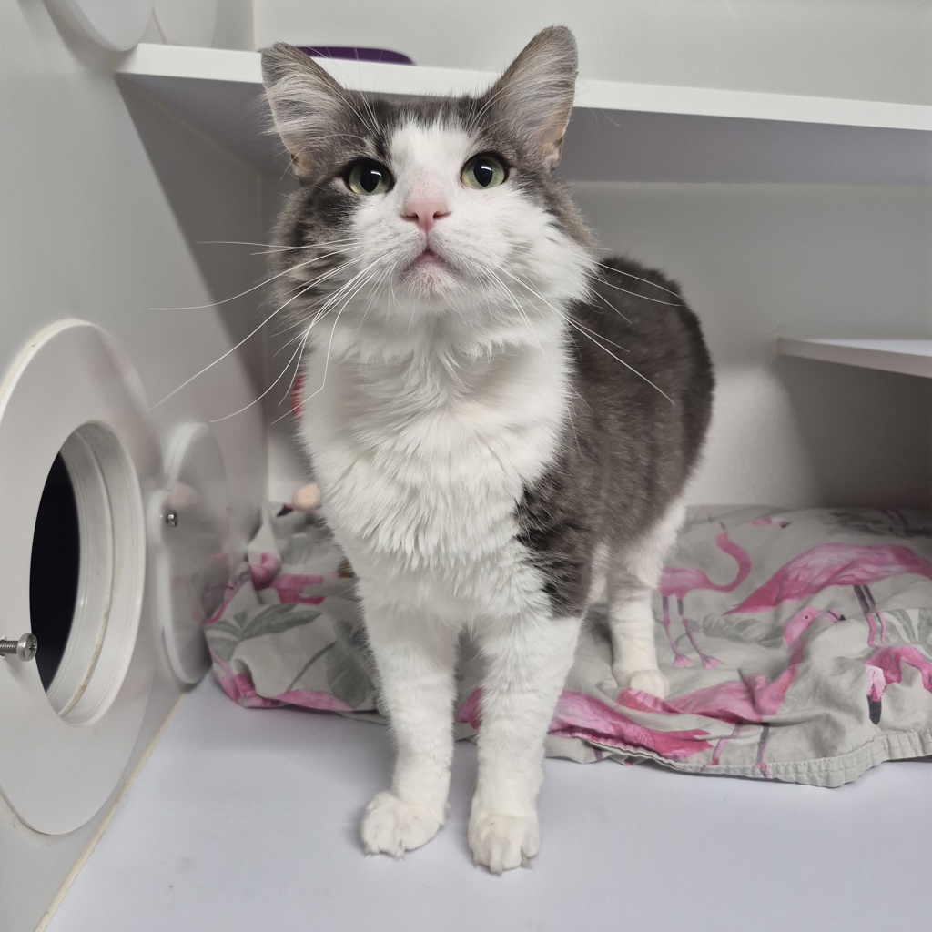 If you're looking for a lap cat, Tucker is your guy. He'll happily curl up with you for a cuddle, purring away while you relax, read, or watch TV. His smoochy nature means he's always ready for pats, head bumps, and quality time.