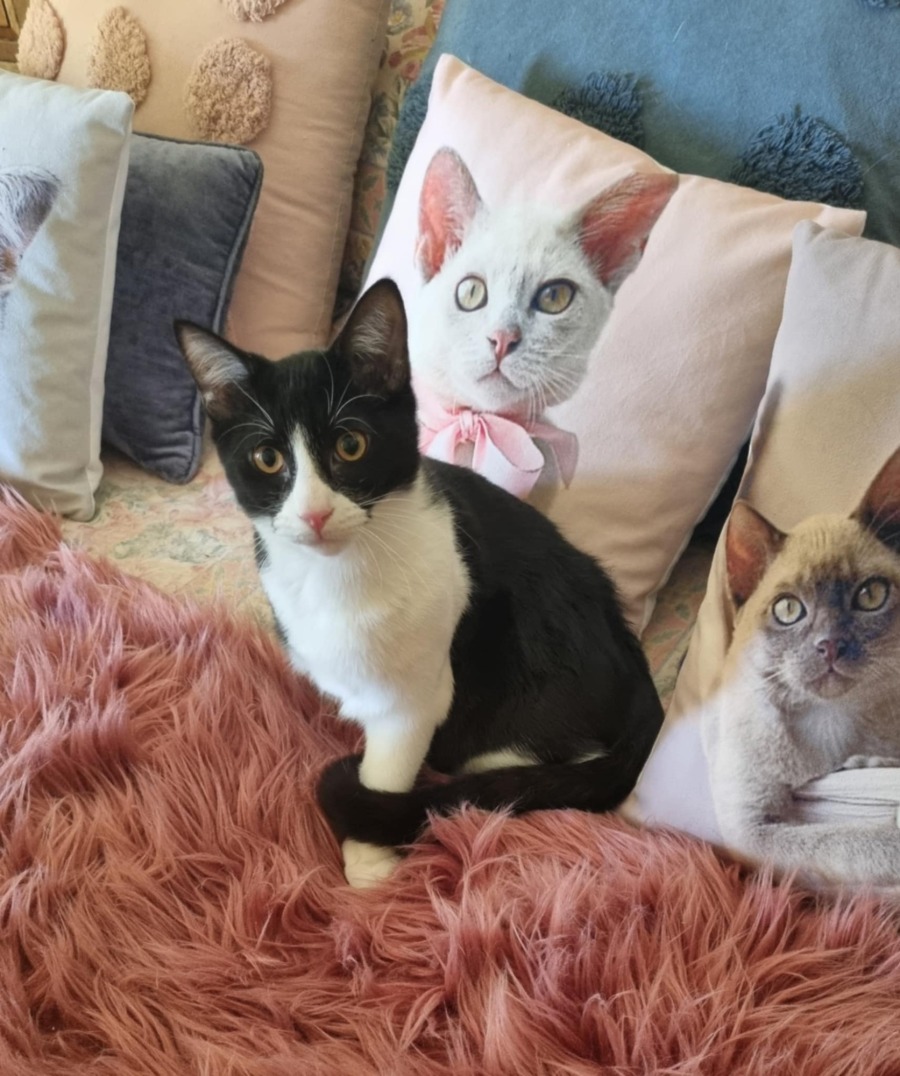 Angus is a stunning tuxedo boy who is full of energy! (typical kitten!) Angus is always chasing and wrestling the other kittens and even playful adult cats. He doesn't care who with, he just wants to have fun!