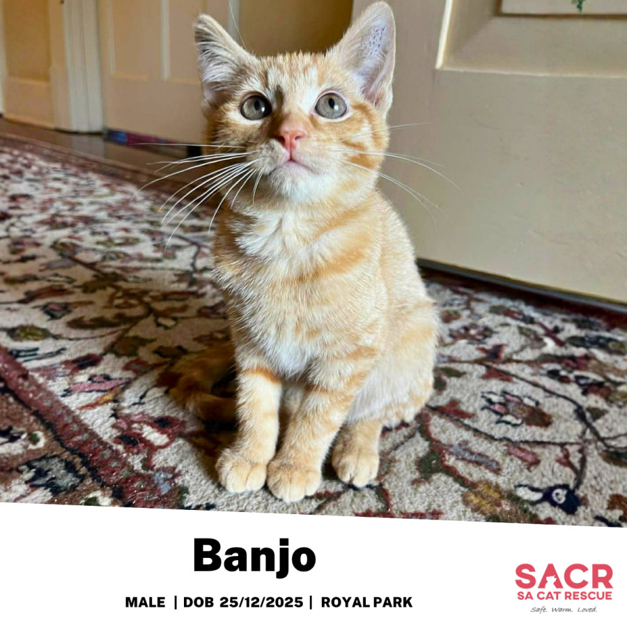 Banjo takes the comings and goings of a busy household in his stride and has patiently put up with the affections of a toddler. He hasn’t met any dogs yet. He grew up alongside his siblings (two torty sisters and a ginger brother) after making the big move from Port Augusta to Adelaide at ten weeks old, and now he’s been given the all clear from the vet and is ready for his next chapter.