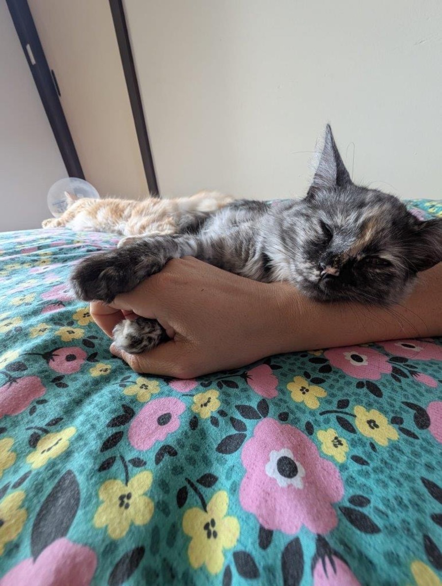Asha loves full body contact cuddles, turning into liquid as she drapes herself over whatever part of you she can get to and purring instantly. She adores belly rubs and will flop onto her back in an instant if they're on offer! She often relaxes so much that she just slides right off. She also loves having her paws massaged, going so far as to stretch and spread out her feet so you can get right in between her little toe beans! She loves to watch tv and even phone screens, sometimes sneaking a paw out to try and have a cheeky swipe herself. When she is not laying directly on you, she will squish up close and rest her little chin on your hand or arm to take a nap. She enjoys some occasional zoomies and playing but mostly likes napping and cuddling.