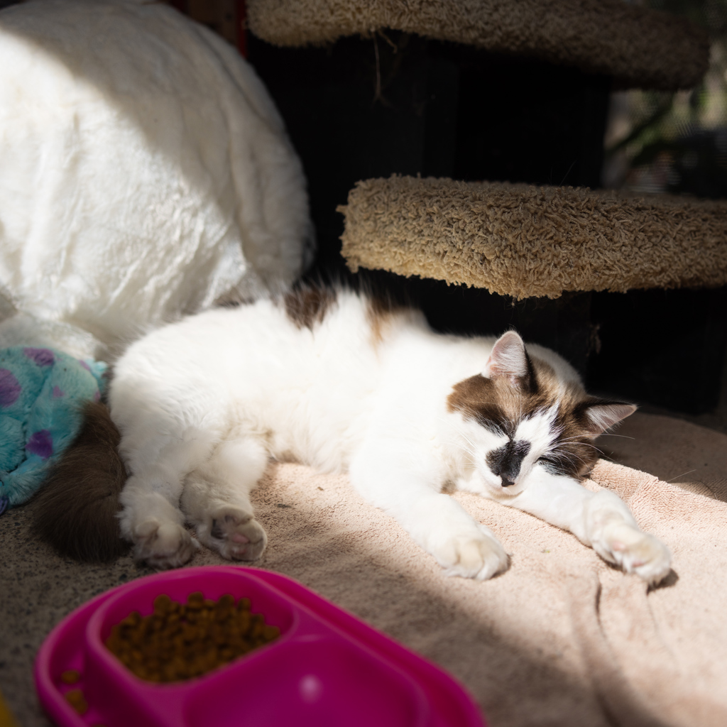 Frank is a big, goofy boy with an even bigger personality. He's the kind of cat who will sprawl out dramatically in the middle of the room like he owns the place (because, in his mind, he absolutely does). His favourite hobbies include lounging in the comfiest spot he can find, supervising your daily activities, and soaking up attention from his humans.