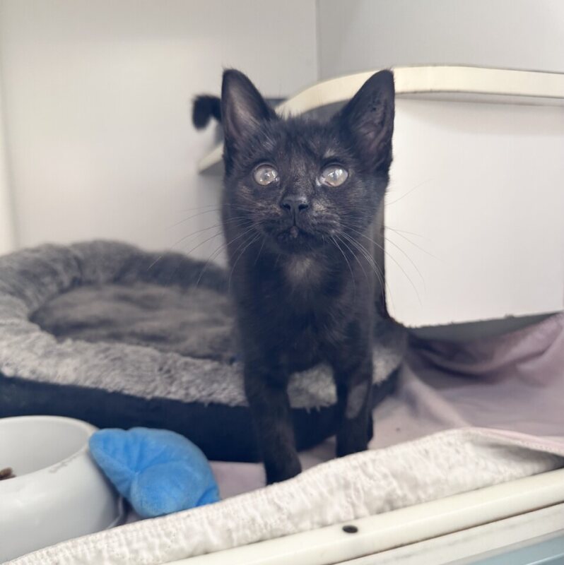 Bagel is a petite black kitten with a big personality packed into a tiny frame. She’s very affectionate and thrives on human connection, always ready to curl up in your arms or snuggle into your lap for a cozy cuddle. Confident and curious, Bagel isn’t shy about exploring her surroundings or making herself at home wherever she goes. She loves being part of the action and will happily follow you around, keeping you company with her gentle purring and bright, attentive eyes. While she’s full of love, she also has a playful streak and can sometimes get a little cheeky with soft, mischievous nips during playtime, just her way of showing excitement and kitten energy.