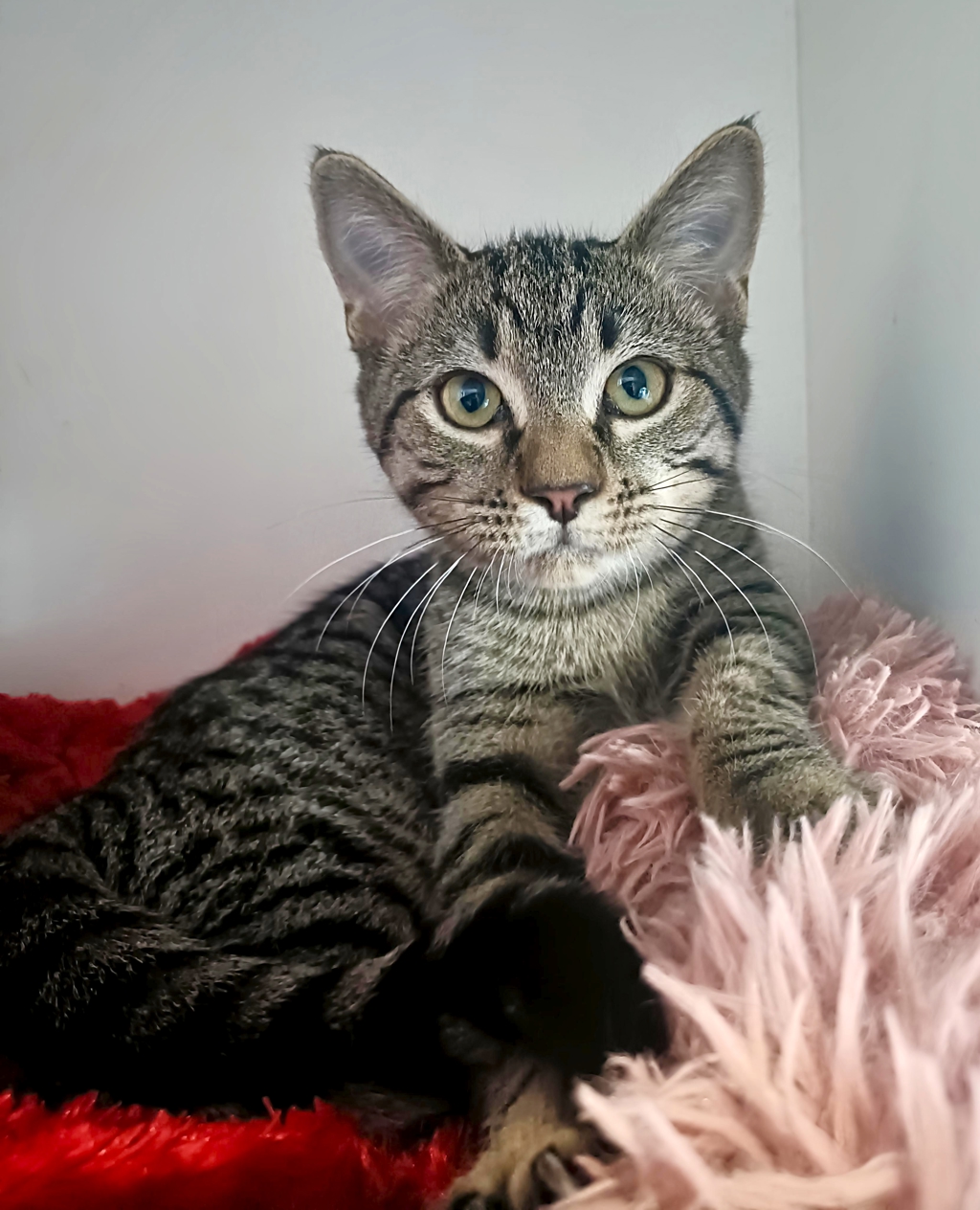 Skylar is a female tabby kitten with a big personality tucked inside a very shy little body. At first glance, she may greet you with a hiss and a dramatic show of attitude-but don't be fooled. Once she realizes she's safe, Skylar softens quickly and leans into gentle pats and chin rubs. She's a quiet observer by nature, taking her time to trust and assess the world around her.