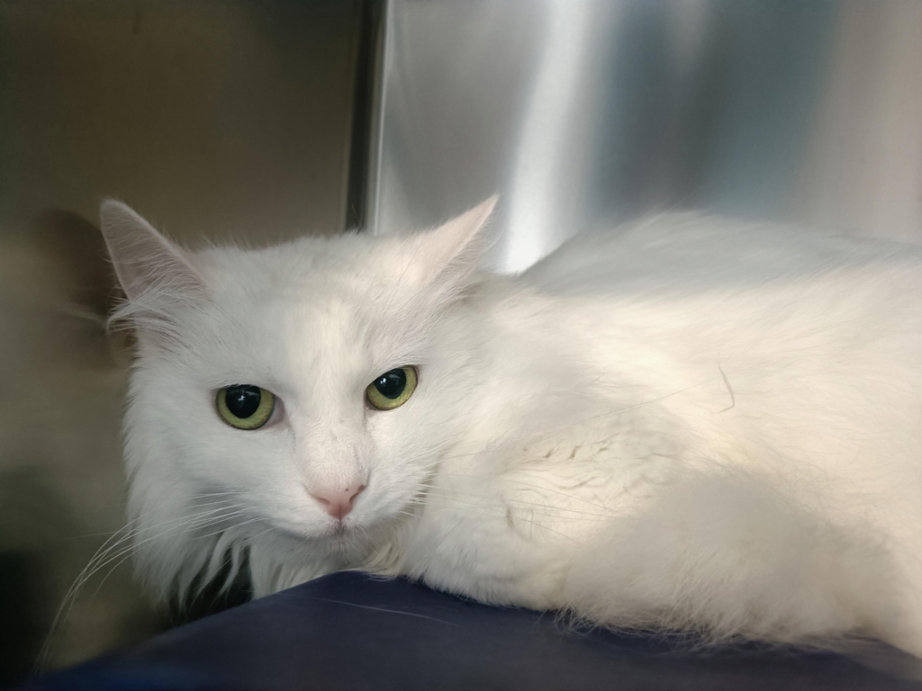 Alba is a stunning female domestic medium hair with a pure, snow-white coat that makes her look like she's stepped straight out of a fairytale. Beneath her beauty is a gentle, sensitive soul-she's very shy and introverted, and will need a calm, quiet home where she can feel safe and settle in at her own pace. Alba has recently had dental work done, so she's ready to start her next chapter feeling her best with a family who understands her need for patience and a peaceful environment. A home without children will suit her best.