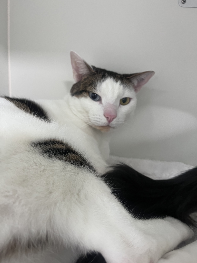 This bonded pair of beautiful boys are ready to find a home where life moves at a gentle, easy pace. Simon (7 years old, black and white) and Stephen (3 years old, white tabby) came to us from a previous home and have brought their wonderfully chilled personalities with them. These two float through life with soft paws and even softer hearts, content just being near their people and each other.