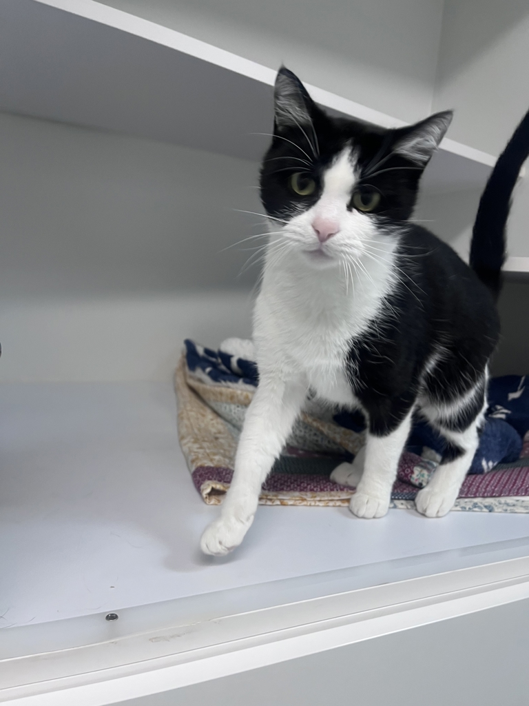This 3-year-old black and white girl is a super-duper bundle of energy wrapped up in a pocket-sized feline package. Indiana is playful, curious, and absolutely full of personality - the kind of cat who turns everyday life into a little adventure.