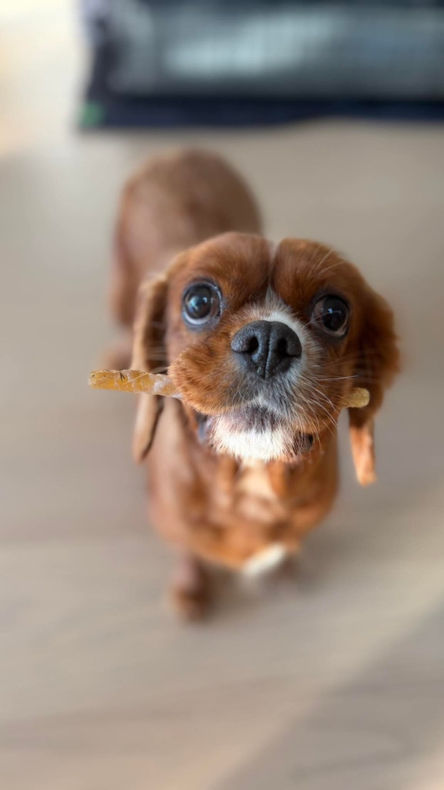 Ruby is wonderfully friendly with people of all ages and has been living with another Cavalier, whose company she enjoys. She can feel a little unsure around new dogs at first and may let you know she’s nervous, but she has never shown any aggression. She has taken quite an interest in the household cat (a little too interested! 🐱👀), so a cat-free home would suit her best.