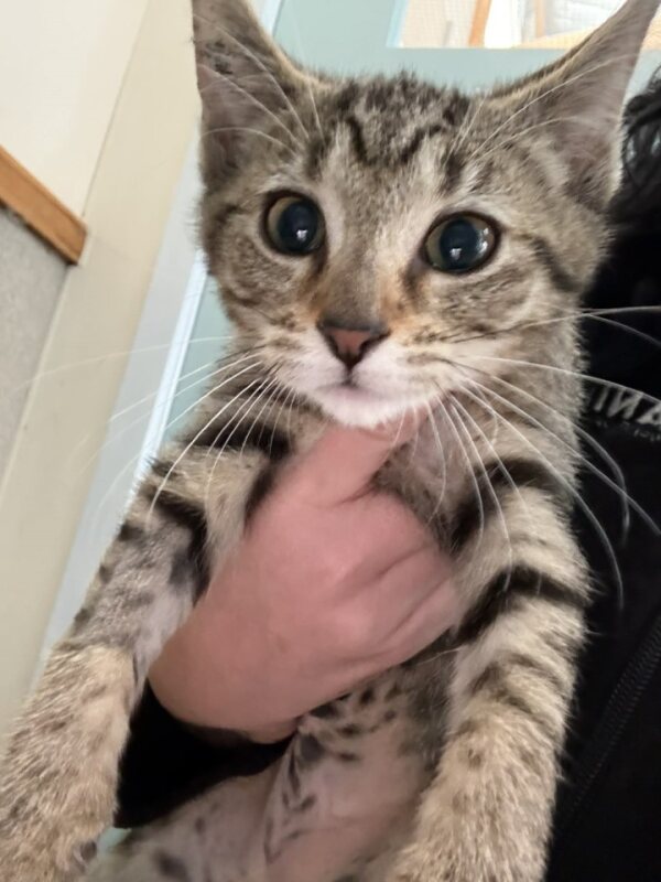 Hey there, I'm Dino. I’m a friendly and affectionate kitten who would suit most homes! My playful paws are always ready to pounce on anything that moves. I love playing with wand toys and mysterious shadows on the wall! When I’m finished playing, I love nothing more than finding a warm lap to curl up in. I have perfected the art of the irresistible purr. It's like my secret weapon for getting all the cuddles and chin scratches I could ever want. Life's just one big, exciting string of moments, and I'm here to make every second count – whether I'm chasing my tail or sharing some purr-fectly quiet time with my favourite humans. So, if you're up for a bundle of furry fun and a lifetime of companionship, please consider adopting me!