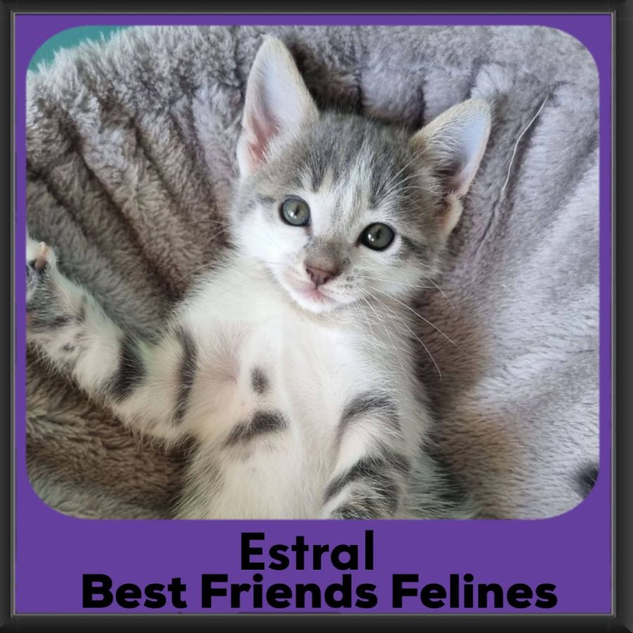 Estral is one of the louder kittens in her litter and likes to complain that her meals aren’t fast enough. She loves playing with her siblings and kitten toys. Estral can often be found in a puddle of kittens with her siblings when it is nap time and loves gentle pats.
