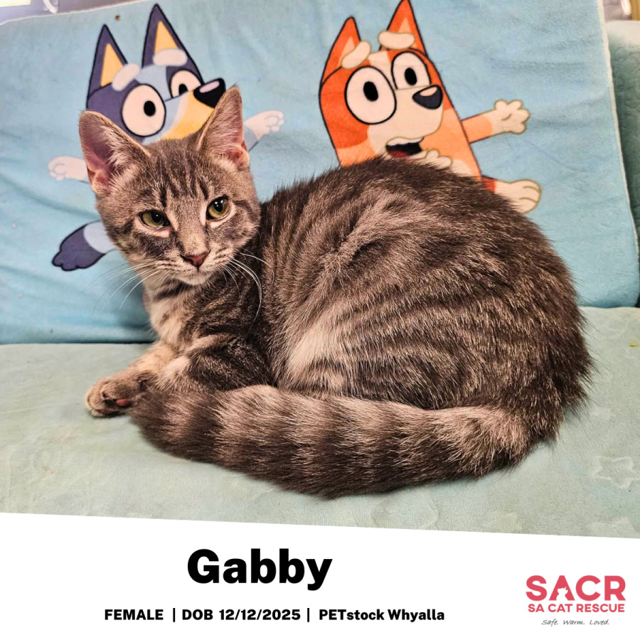 Gabby's adoption fee is $195 which includes desexing, microchipping, parasite prevention, and initial F3 vaccination.