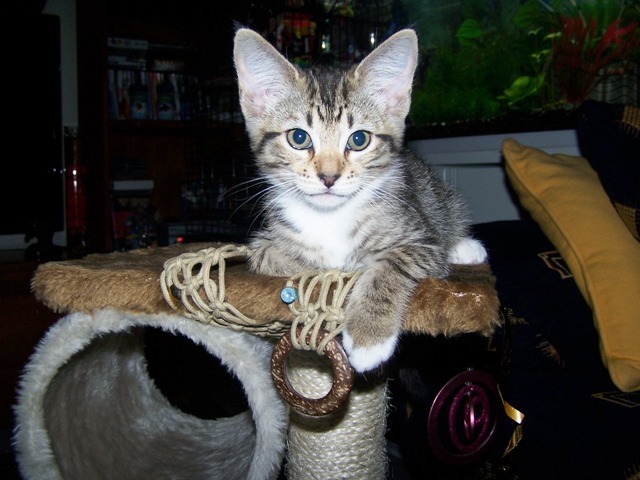 Jemma is a very pretty silver tabby & white, she loves to play but is a bit quieter & often likes to sit & watch the others
