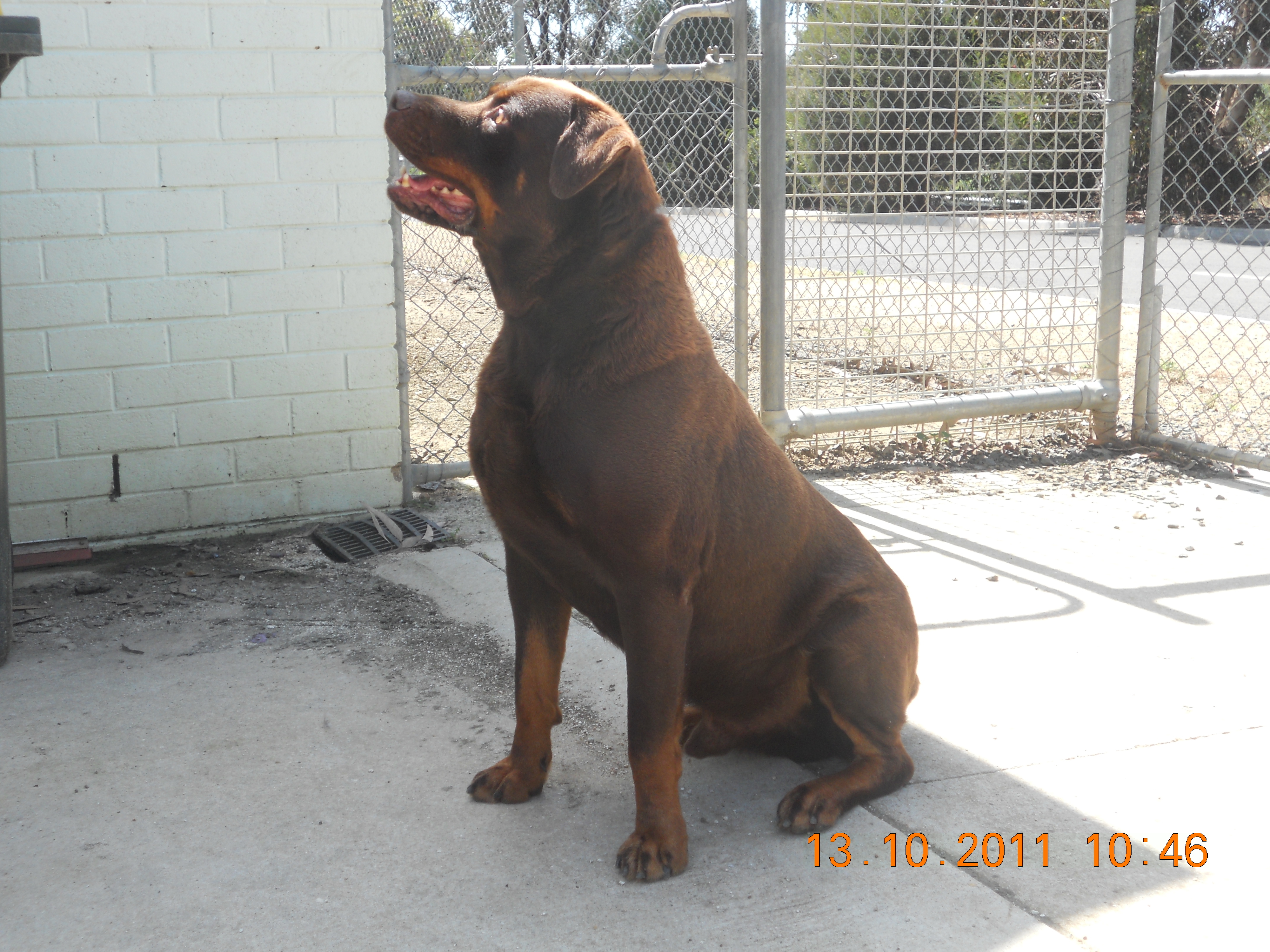 hooch is a very rare red rottweiler. He is purebred however instead of being black and tan he is dark brown / red and tan. He is 9 years old and looking for a new home that would love a big dog. Hooch is mildy deaf however this doesn't stop him from playing ball (he is ball mad!!) or knowing how to sit, stay or shake hands. He would suit someone who is wanting a well trained, larger dog for company