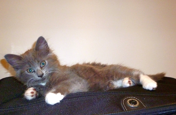 Apart from being a gorgeous fluffy, smokey grey kitten, cuddles is the gentlest of the litter. She has that lovable, playful kitten nature but is more cautious about new things and noises than her siblings. Curiosity will generally get the better of her and she will forget her fears and come running out to play. Cuddles like nothing more after a good play than to lay in your arms and fall sound asleep. She is a very affectionate kitten and would probably benefit from being adopted with one of her brothers or sisters or to go to a loving home where she can be introduced gradually to a new environment
