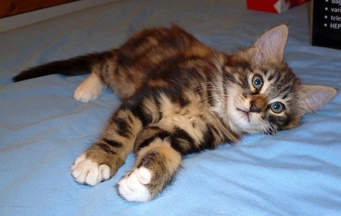 Cleo is the bravest of the litter. She is always the first out to play, the first to the dinner bowl and the first to explore anything new. She has one of the cutest faces with a mane of fluffy fur. Like her siblings she is also very affectionate and runs to greet you purring loudly. Cleo would adapt well to other household pets as long as they were up for a game with her! cleo is looking to be adopted by a special person with time to play and a lap for cuddles