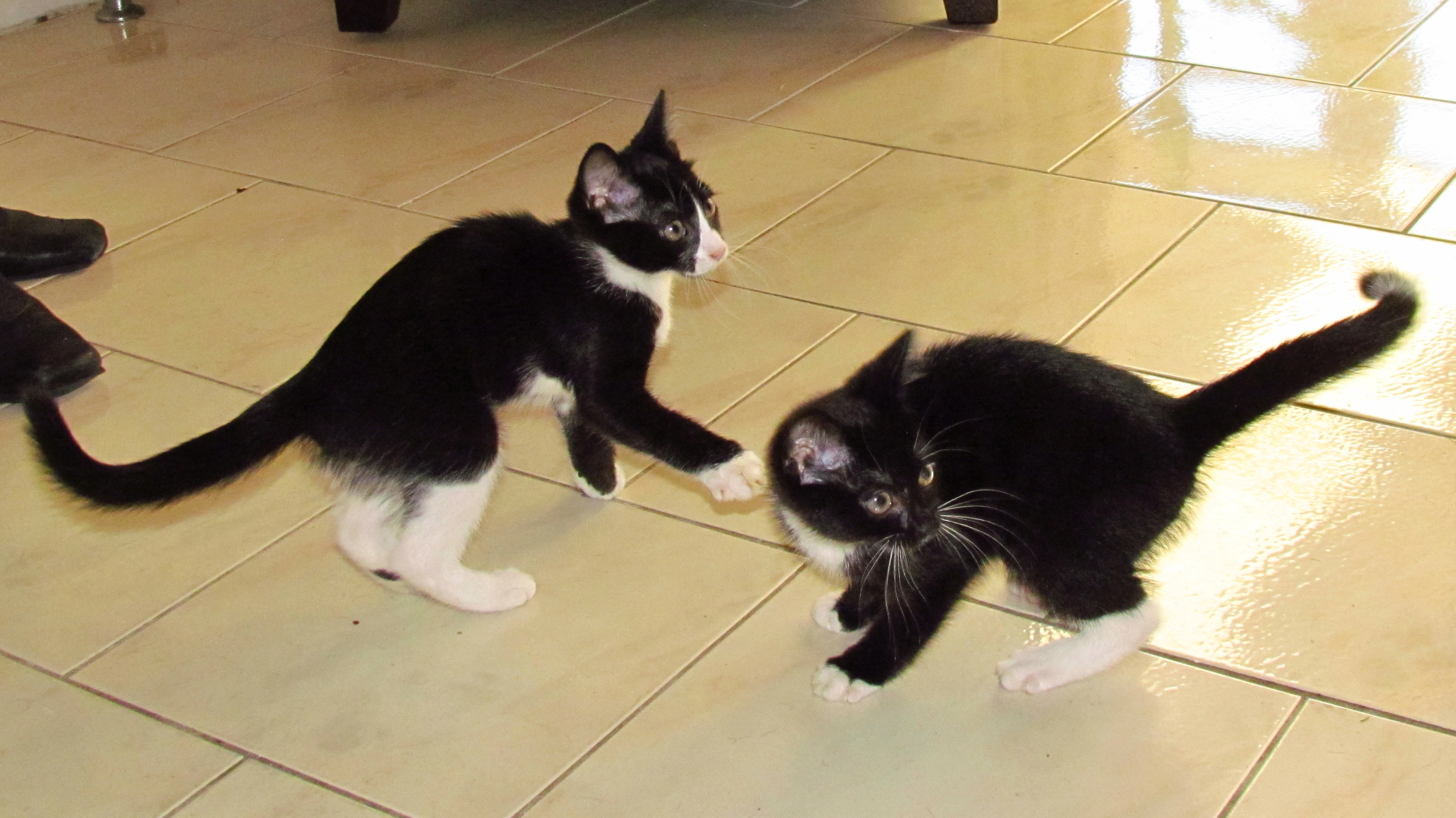 Cheron's kittens are full of energy and love to play. They are all black and white (only one is entirely black) and love to play and wrestle together. The kittens are very friendly and love to be patted and will also fall asleep in your lap when they tire themselves out. All the kittens are litter trained and learning to use their scratching post. They are ready for their new home now!