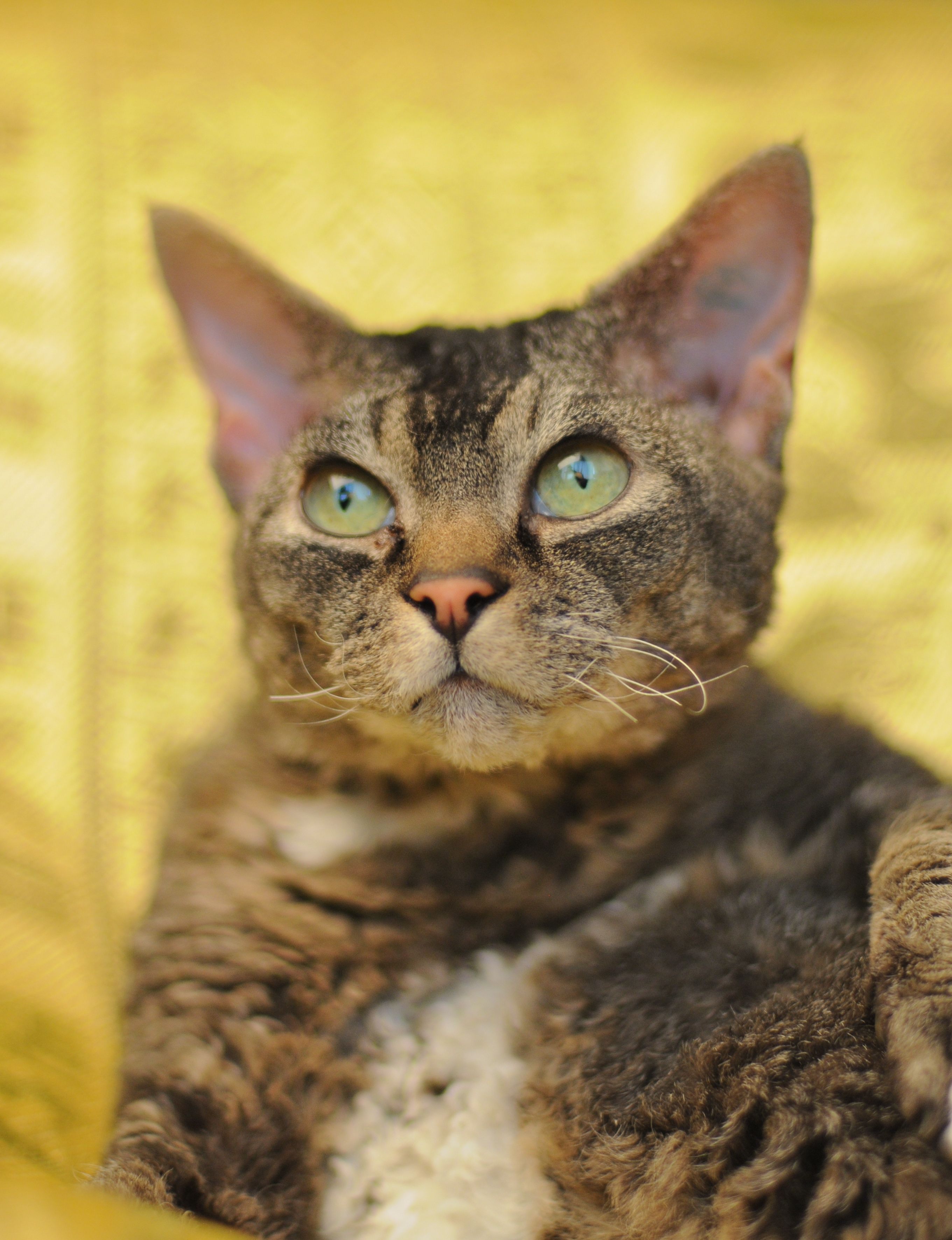 Clodagh has striking bronze highlights on her tummy. She is a self-possessed but affectionate girl who is used to having an older and somewhat sedentary owner and is happy to be an indoor cat. She has a sensitive stomach - despite her short woolly coat she is prone to hair balls and therefore needs to be fed a diet of hairball-specific dry food and fresh meat as proprietary wet foods give her diarrhoea. Because of her short coat she sometimes requires bathing and grooming to prevent a build-up of excess oils. Her ears also need cleaning regularly. Clodagh is highly intelligent; used to living with other cats; receptive to close contact with humans, and likes to drape herself around your shoulders. Unusally for the breed, clodagh will protest loudly if she is unhappy about something - such as being kept in a carrier too long!