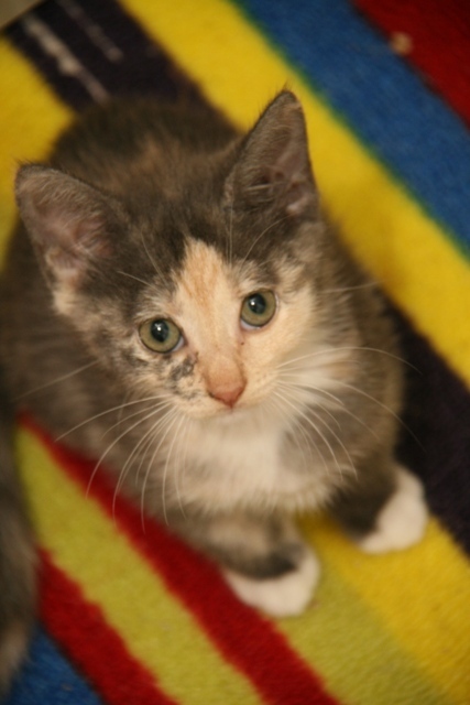 Sprinkles' family was dumped at the vet and never picked up. They were riddled with fleas, ringworm and belly worms and were so skinny you could see their ribs. After some tlc and medication, plus lots of tuna and organic dry kibble, they're all healed, happy and healthy. Sprinkles loves other cats and doesn't mind dogs, and would be a great addition to any family situation, especially with kids because she's so loving and gentle. She's affectionate and purrs when petted. Sprinkles is more loving and sweet than her siblings, and much happier sitting on your lap getting love than running aroung playing