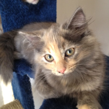 This is tinkerbell. She is 10 weeks old. She is a blue torty medium coat. She is a bit reserved, but likes to play with toys and cuddle with you of a night. She is very curious of the dog and interacts well with the other adult cats. Please contact her foster carer for more information