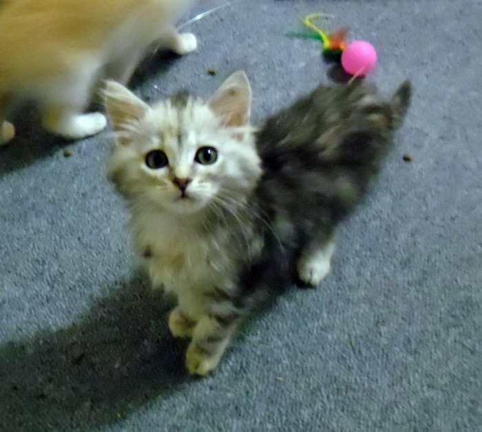 cc is a happy, friendly little girl who loves to play with the other foster kitties and all of their kitty toys!