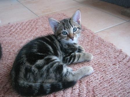 Chester is a 8 week old male tabby. He is a very sweet loving happy go lucky kitten. He is a tabby with very black striking markings on him. Chester is great with other cats/kittens dogs and children