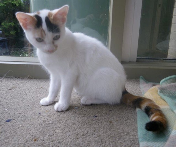 Corallee is a 12 week old female short hair kitten with white and calico marking of ginger, black and grey. She has an unusual ginger stripey tail and a very sweet disposition. She is very playful, gets along with the other kittens and yet is always ready to curl up on your lap while purring contentedly. Corallee would be suitable for a family with other pets or equally for a single person looking for a special feline to share their life with