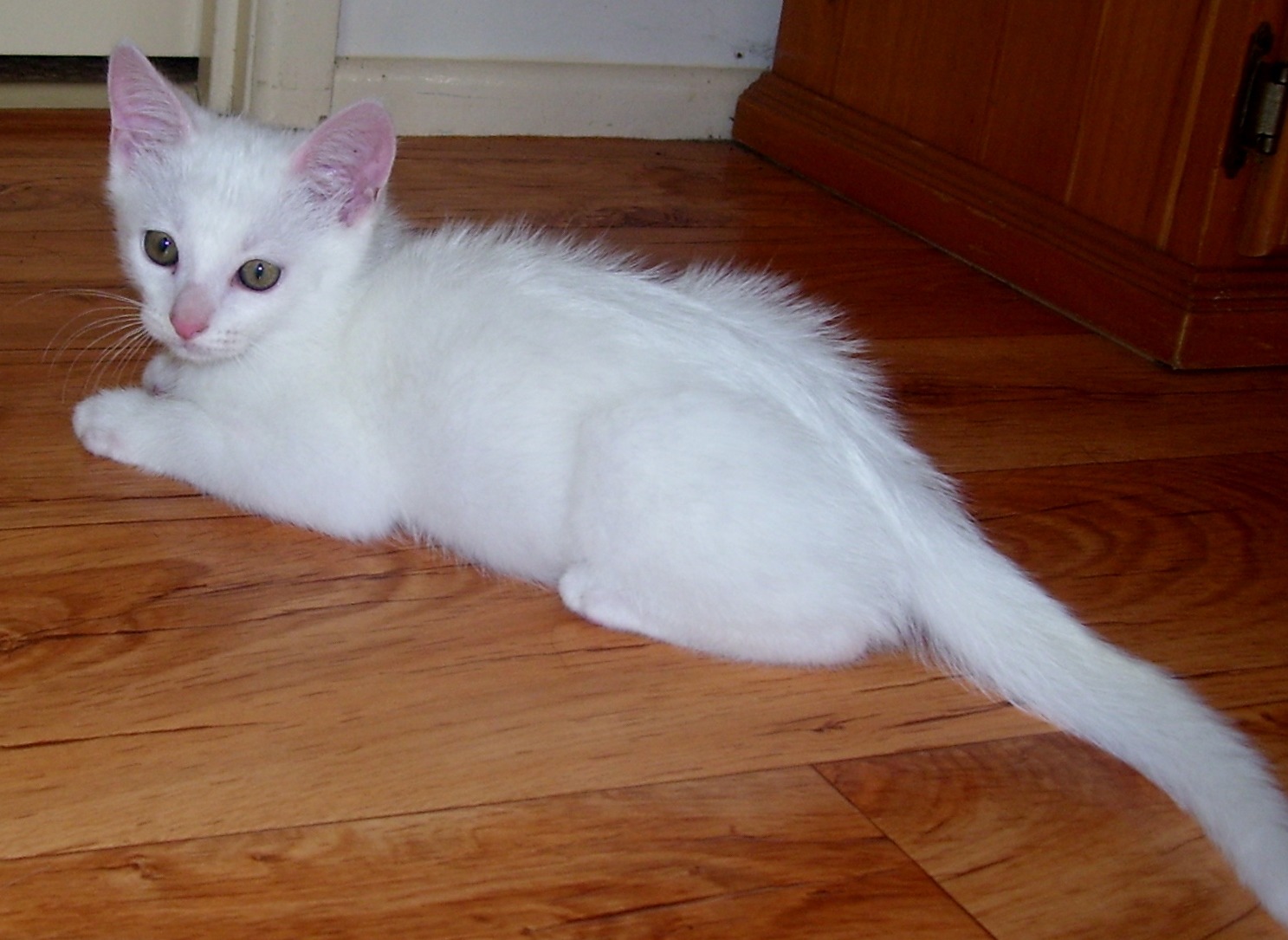 Nugget is a typical boy, loves to play and does play rough. He was rescued from the pound with his mother and siblings. He would do well in a home with young children or cat friendly dogs as he loves to play and he loves people, he will need an indoor home as he has pink ears that will get sunburnt if he is outside. He will be desexed, microchipped, vaccinated, wormed and flea treated. He is available for pre adoption and will be ready to go to her furever home early february