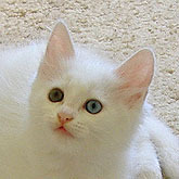 Puffy is a beautiful 10 wk old white fluffy female chinchilla x kitten with 1 blue and 1 yellow eye like her mother, sugar. She has a lovely nature, is friendly, loves to play and gets on well with other cats