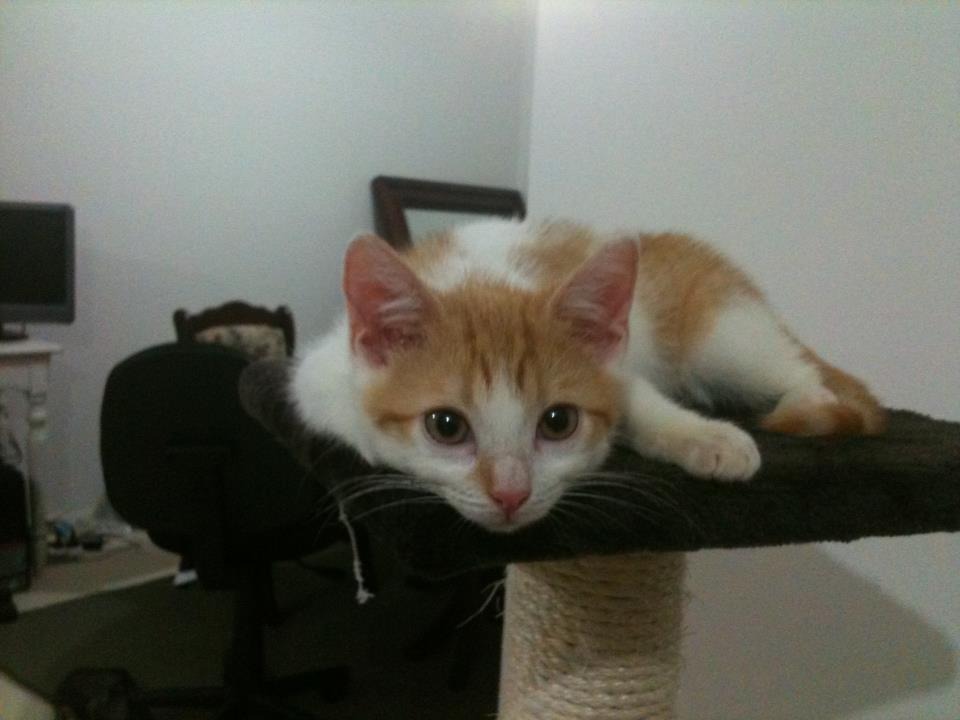This little man, puss he is about 10 weeks old and is ginger and white. Puss has a very sweet nature, loves cuddles but also enjoys a good play. . . Puss has been living with children, dogs & other kittens