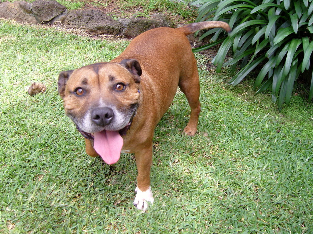 Griff is a pure breed english staffy. . Griff is fantastic with cats, and he loves loves loves swimming. . He is an affectionate, energetic ball of fun, he would love to run around playing games with you all day, but yet he would also sit with you quietly, very happy just being next to you getting the odd pat. He is just a gorgeous natured boy inside and out!