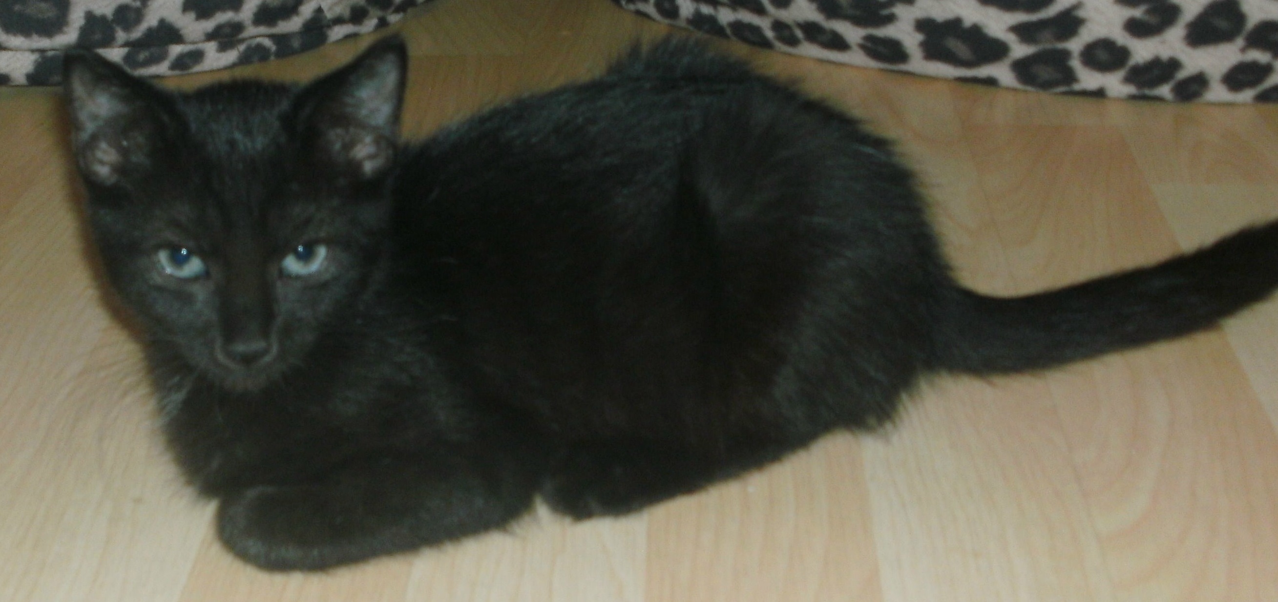 'when danger reared it's ugly head he bravely turned his tail and fled. 'brave sir robin is a gorgeous black cat. He is noble and handsome. He likes to play but he also knows when to run away. He has the most beautiful aqua green eyes and he's well sized for his age of twelve weeks. Sir robin needs a gentle and patient hand and some understanding still due to not having spent an awful lot of time with humans so far. He is quick to love and would make a wonderful companion. . . . My best time of day is when i lie on the couch and he comes and snuggles up to me and falls asleep. . . . . Come and meet him today!