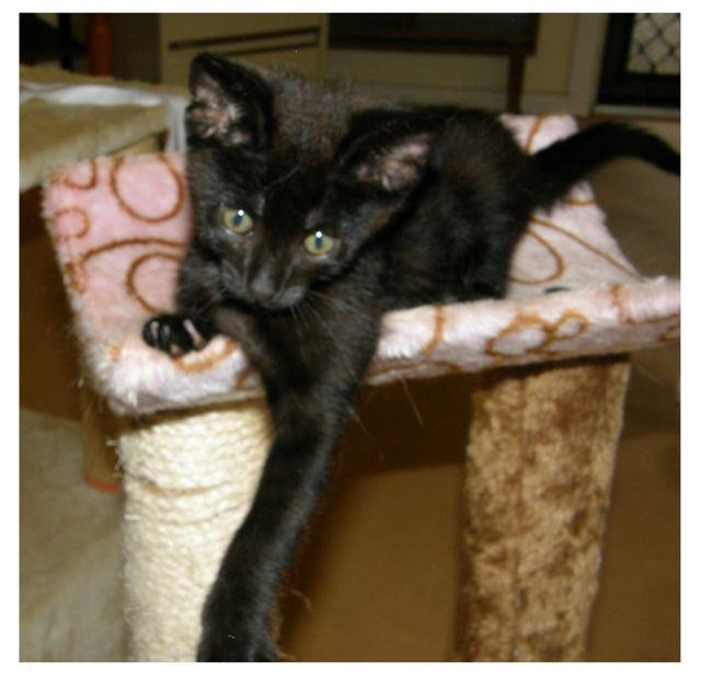 I am now ready for a new home. I have a very shiny black coat. Everyone says i look like a little panther as i am slim and long and love running flat out and chasing the other kittens
