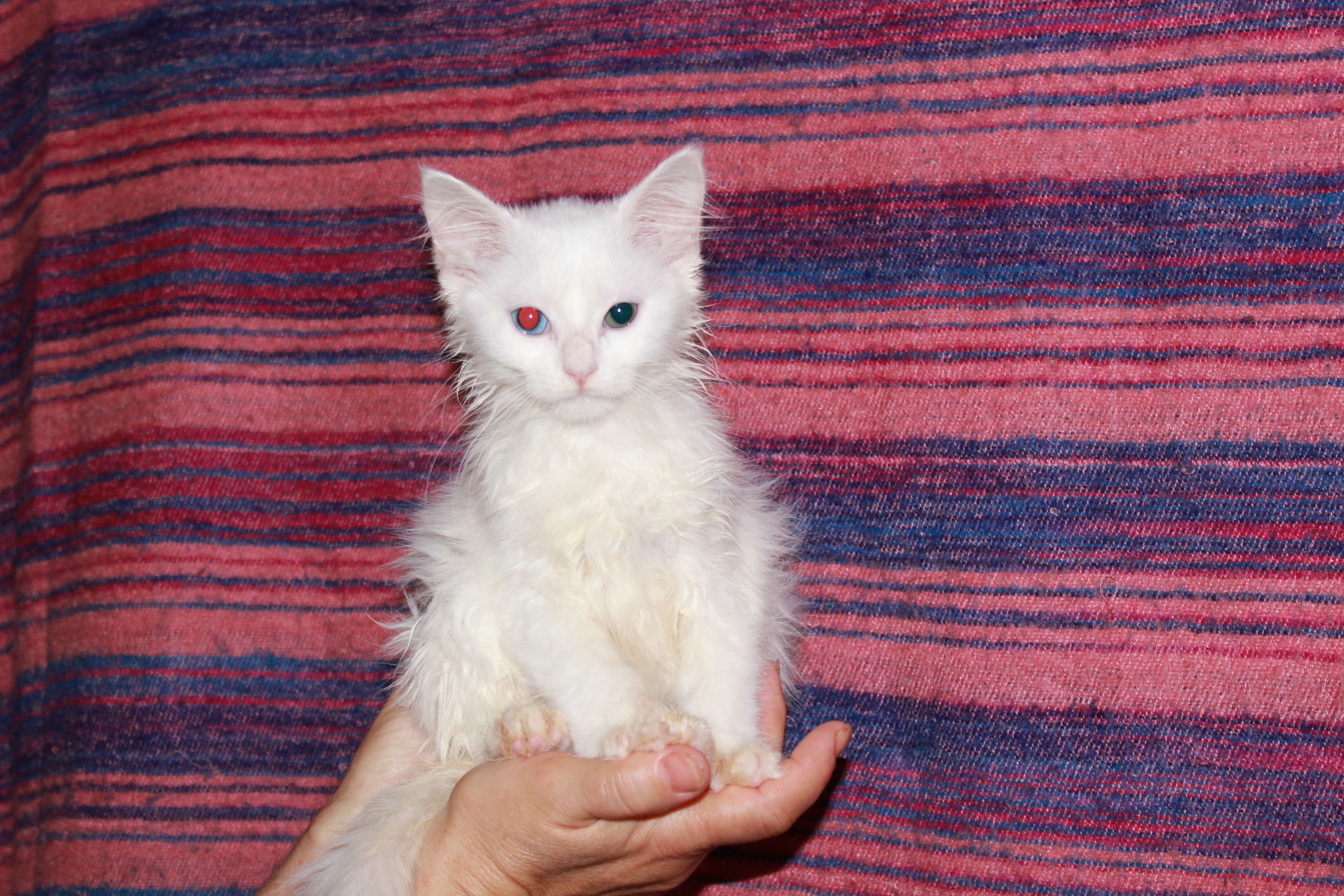 She is a beautiful angora kitten with2 different eye colours. One blue and the other blue/ green. Aramis is very cheeky and loves to be played with or just cradled in your arm. Because they have to stay in the bathroom in quarantine for a while the do love when they get a visit and are all up for a fun time. Aramis is still the baby. She has 2 big brothers. When they arrived at my place they were flea ridden and we fleaed them. They day after they had a bath and the water was just pink. The poor little kittens were sucked nearly dry by this nasty critters. They had ringworm patches all over there face and looked really in a bad way. If you like to see some pictures of them before they got treated check out our facebook site on 2nd chance cat rescue. You do not need to have facebook account to have a look at the pictures