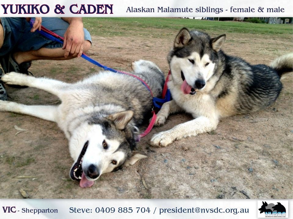 yukiko (left) is a very pretty 2 year old malamute girl at approximately 40kgs and needing a furever home with her brother caden. The siblings have not had much exposure to small children or other dogs and would benefit from further ongoing training. Caden (right) is a handsome 2 yr old malamute boy, who is quite large at around 55kg, who is looking for his furever home with his sister yukiko. They have not had much exposure to small children or other dogs and would benefit from further ongoing training. At present they are prone to jumping up in excitement. Due to a medical condition that prevents their primary owner walking them, the family would like to see them go to a new home where they can still be together and receive all the attention, care and exercise they deserve. Strong secure fencing is a must and an owner who is prepared to exercise daily and groom regularly to keep them in top condition. Contact steve at: