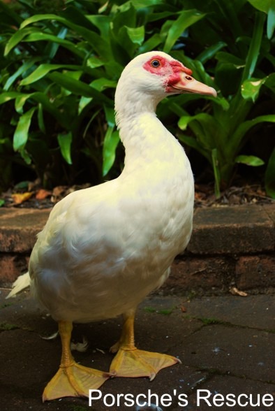 jeremy is a muscovy. He was rescued from a pound, and is a lovely mannered duck. He is easy to handle, and very quiet. You can't really tell from the photos, but he actually has bright blue eyes that are very startling. He also wags his tail when he see you!