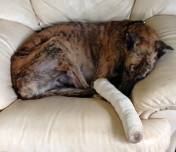 Alfie is the ultimate couch potato! like all greyhounds i hear you say. . . True! but alfie is your living greyound sofa cushion! he drapes or curls himself on the lounge and doesn't move. He is a very affectionate boy, with an easy-going nature. He can display a little anxiety in new surroundings but adjusts quickly. Mr chill pill is great with other dogs of all shapes and sizes - currently in foster care with other greyhounds and a little italian greyhound. P. S don't let the bandage put you off - his fracture is healing nicely and will not pose a problem for his adoption