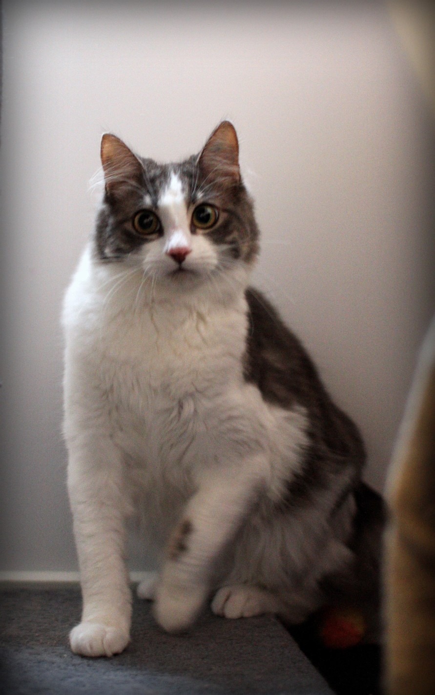 Louie is very sweet. He loves to play and he loves his belly rubs. He gets along very well with other cats and kittens. He is not too fazed with cat savvy dogs either. He likes to steals pats if you are patting someone else. He will sneak up and slide himself in-between you and the other cat!