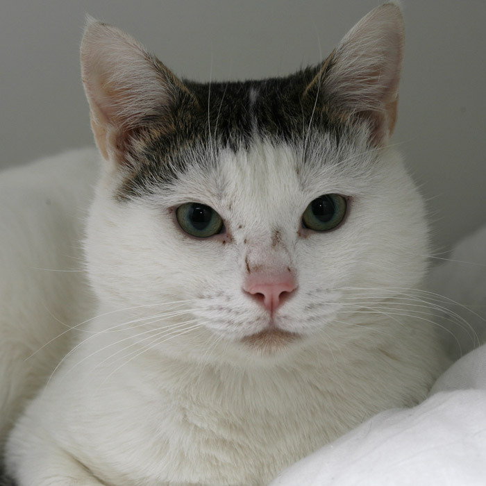 Friendly randall is a real cutie. He is white with a tabby forehead and tail and seems to be tolerant with the other cats. He is a little shy to begin with and would need a bit of patience to bring him out of his shell and make him shine