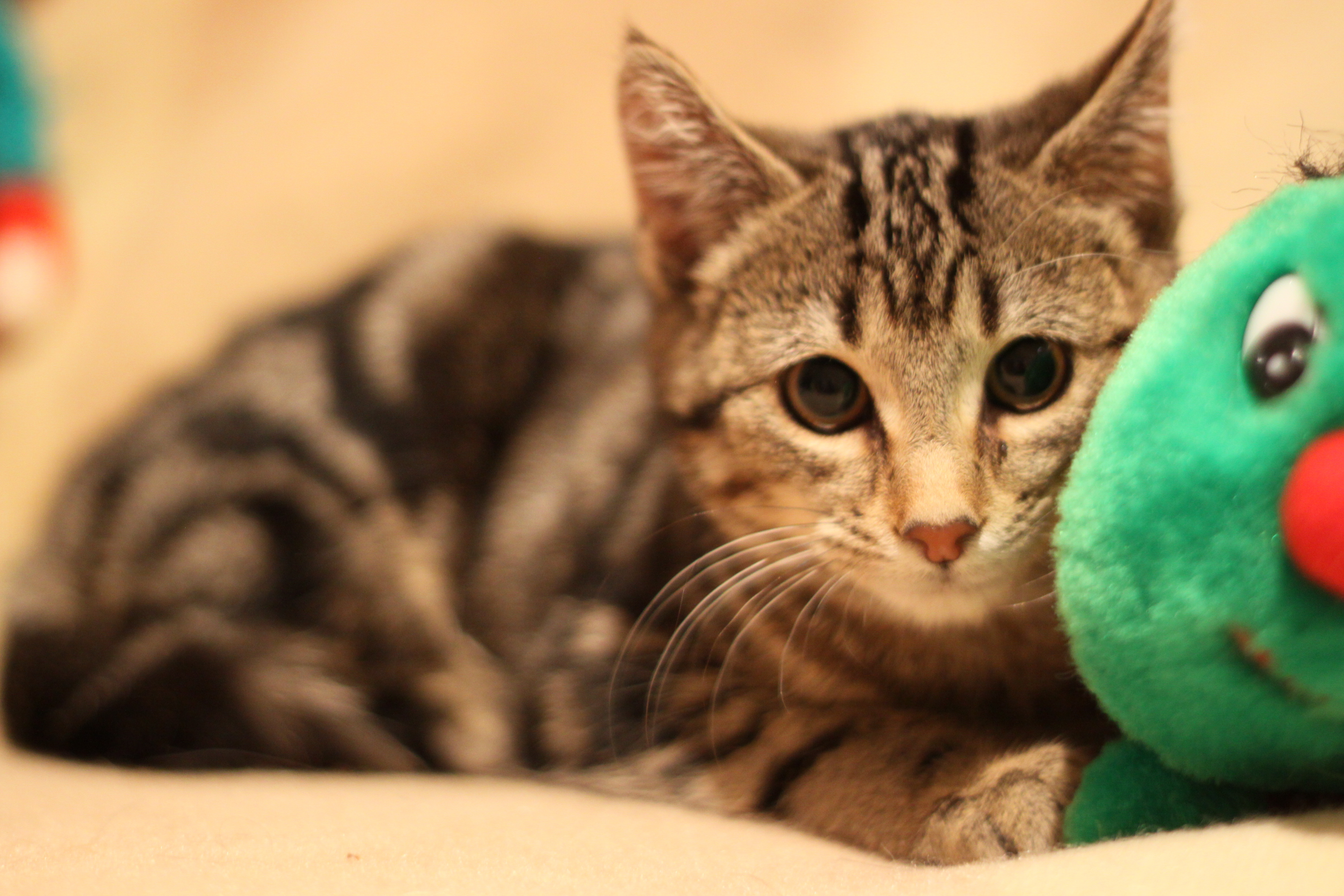 this little girl has a very sweet temperament, she is easy going, gentle and very affectionate. She is happiest when cuddle up with you and giving her special kitten kisses. Once dixie feels safe with you there is no getting rid of her, she follows you around the house and chases your shadow. If you are looking to adopt two kittens you should definetely look at adopting dixie and her brother dougal. These two are great together, the eat, sleep and groom eachother all day long!