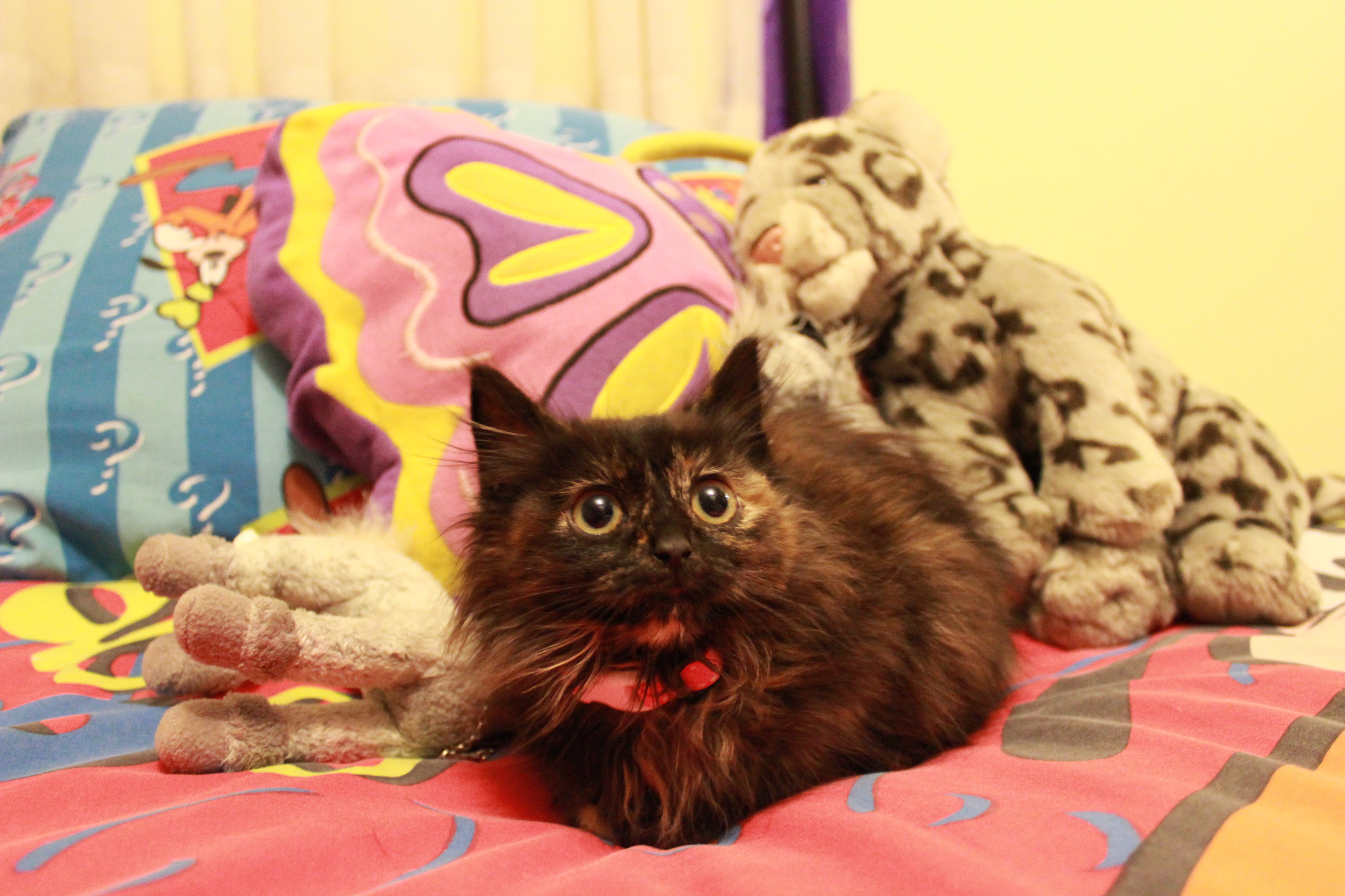 fluffy is the cutest and sweetest little fluff ball! how can you resist looking into her beautiful big green eyes, and patting her silky smooth fur? fluffy has a gentle and loving nature. She was rescued at a very young age, with her siblings, from a site in melbourne. She is currently in foster care with a family with children, and is enjoying their attention and affection. She is a little quieter than the other kittens, and can be shy when she first meets someone. However, with a little patience, in no time, this little fluff ball will win you over! fluffy is looking for loving forever home, one which will give her lots of tlc and cuddles!