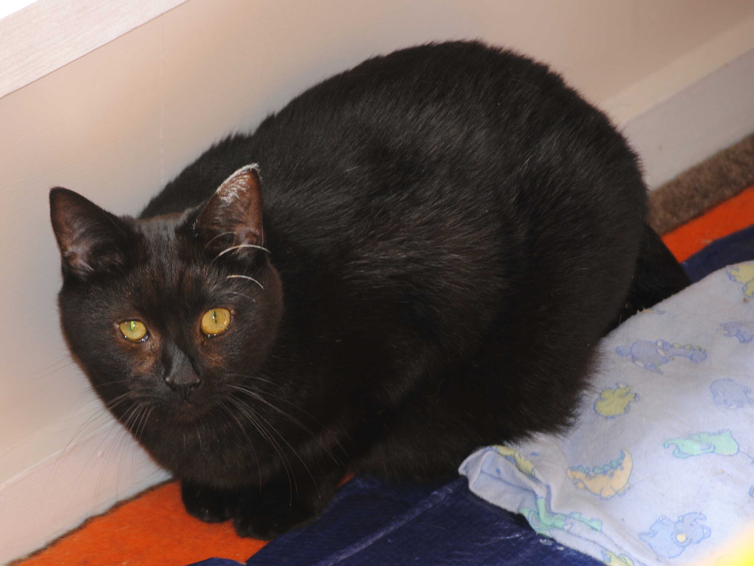 Midnight was surrendered after her owner sadly passed away. She is scared and unsure in her new surroundings and needs a quiet home preferably with no other cats. She has a slightly deformed nose which leads to her having leaky eyes sometimes that will need cleaning. She is not comfortable in her current surroundings with the cat she shares her room with so really does need to find her forever home. Are you the special person who will take midnight under your wing and help her become the confident cat she wants to be?