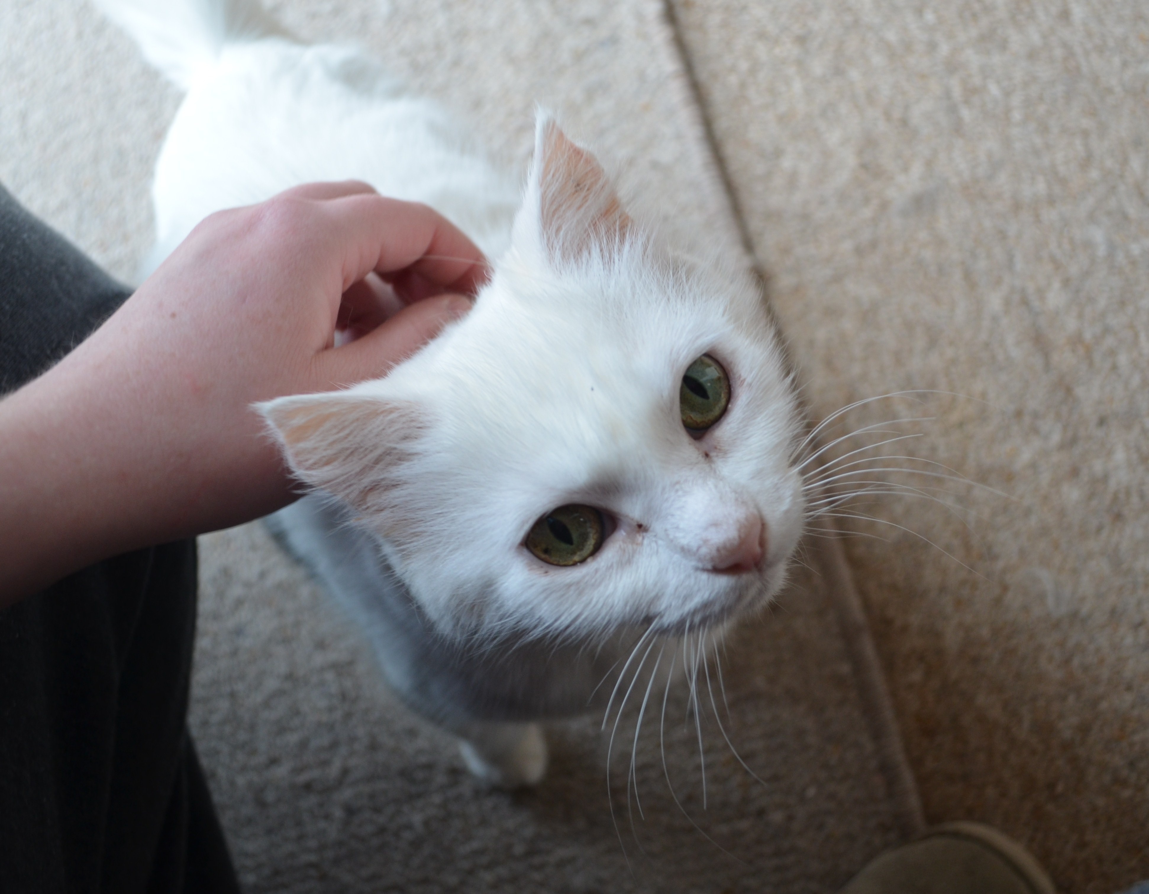 -Layla will need to be an indoor only cat for the rest of her life (unless you have a shaded outdoor enclosure for her to spend some time in!). Cats with pink ears and pink noses are at high risk of developing skin cancers.