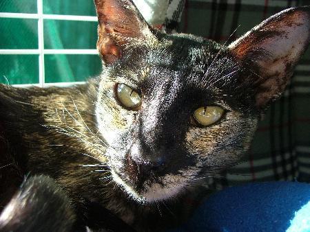 Mingming is a little shy when she first meets you but she adores people and never stops talking or smooching. She doesnt seem to mind other cats once she is used to them. She just needs love and kindness lavished on her and you will have the most loyal companion you could wish for. . . . Not to mention the most talktive!! she is a dark calico/ tortishell colour very unusual markings