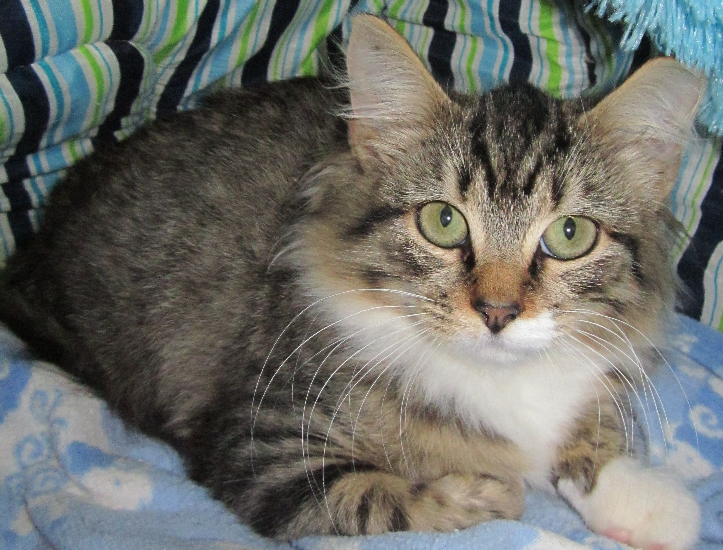 Gemini has been at the animal shelter since 21/5/12. Gemini is a gorgeous looking kitty with her luscious fluffy tabby and white coat. She was such a terrified little bundle of kitten when we first met her but the more love she receives from her human friends the more she is coming out of her timid shell. She loves a good pat and cuddle and shows her appreciation by loudly purring for more. She enjoys the company of her feline companions so will be suitable to a multiple cat household. Gemini will be at her happiest and kept safe with a life indoors as long as she has plenty of toys to play with. She will require some daily brushing which she will enjoy and this will help with her bond with her new family as well. Gemini’s new family will need to be a little patient and understanding when they first take this beauty home but in no time at all this stunning girl will become the love of your life and you will become hers!