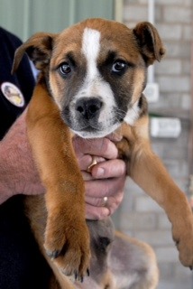 This boy is a 12 week old staffie cross ridgeback (part of a little of six, all are for adoption). He is a an active puppy and will grow up to be a medium to large dog. He has very striking markings. He has been more shy than his brothers and sister and will need a new owner that will be able to build up his confidence and teach him good doggie manners and socialization skills. He will cost $350- to adopt and this helps to cover some of the costs associated with de-sexing, vaccinations, micro-chipping and flea and worm treatment. For more details please call the rehousing ranger between 9-5 monday to friday on 0417 517 048