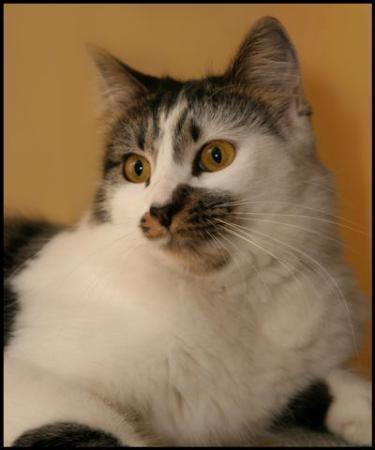 Mummy cat was dumped with her three kittens at the beginning of the year. She is a beautiful girl, white & dark with a few tabby markings and a great plume of a tail. She is very friendly and affectionate and is used to being an inside cat since she has come into foster care. She gets on well with other cats. She needs a human who will be love her and be committed to her for her lifetime