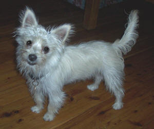 Salty is enjoying his foster home with two four legged companions and five two legged ones. he was quite timid when he arrived but has come out of his shell to show his delightful personality. he is quite a small dog about the size of a sydney silky with spiky fur that gives him a really cute look. salty is easy to bath and his off-white coat is very easy to manage. Salty is in foster care with molly who just loves him and he loves her. they never get jealous of each other and we think it would be important for salty to be rehomed where there is another dog for companionship. he is probably not suited to a home with little kids though as he is quite lively. salty is toilet trained and has had no little accidents but he will need to be allowed to go out for his business on a regular basis. he is great in the car, loves to go on outings, doesn't chase cats and doesn't bark unnecessarily. Salty will sleep quietly all night long on the end of the bed without wanting to go out. he does like a cosy lap to curl up on at night and he will sleep soundly for as long as you are prepared to sit. salty is enjoying being part of the family and loves all the positive attention he has had at his foster home. he would be an adorable and fun addition to an active family but really would need to be homed with another small dog for companionship. salty is a gem!