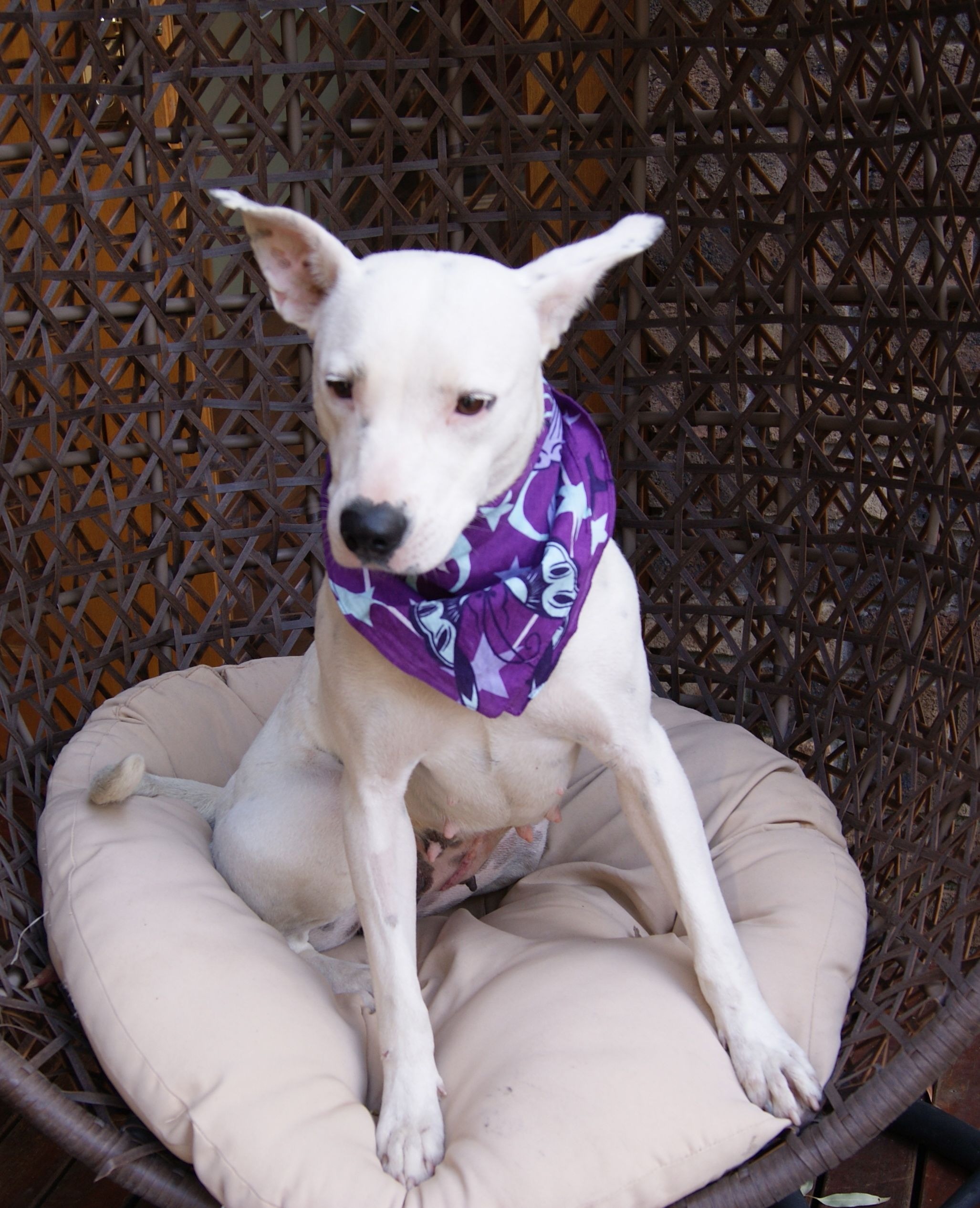 Lucy is a 14mth old Dalmation x. She is small for breed. She is a sweet gentle girl with a soft easy temperment. She loves to play with the 6 dogs she is living with. She loves to be stratched on the tummy. It makes her give a big doggy smile. She is great with free ranging chickens.